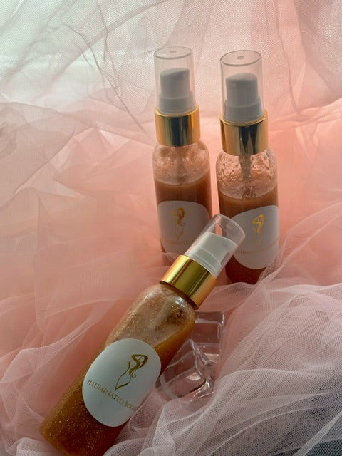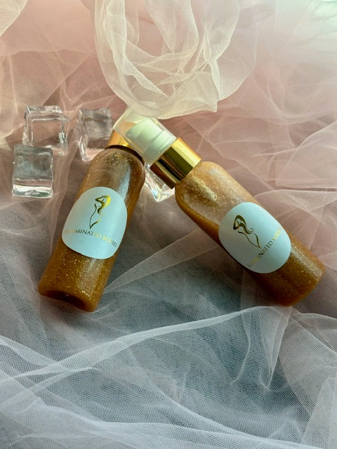 Time to Illuminate. Achieve a radiant, sun-kissed glow all year round with our Illuminated Shimmer Body Oil. This shimmery oil hydrates and moisturizes, leaving your skin glowing and smelling delicious. This shimmer body oil can be used as a body highlighter, on the arms, collarbones, legs, shoulders, back. This Shimmer body oil is moisturizing, nourishing and the shimmer shows on the skin beautifully. Shake well before use. Available in 2 oz.